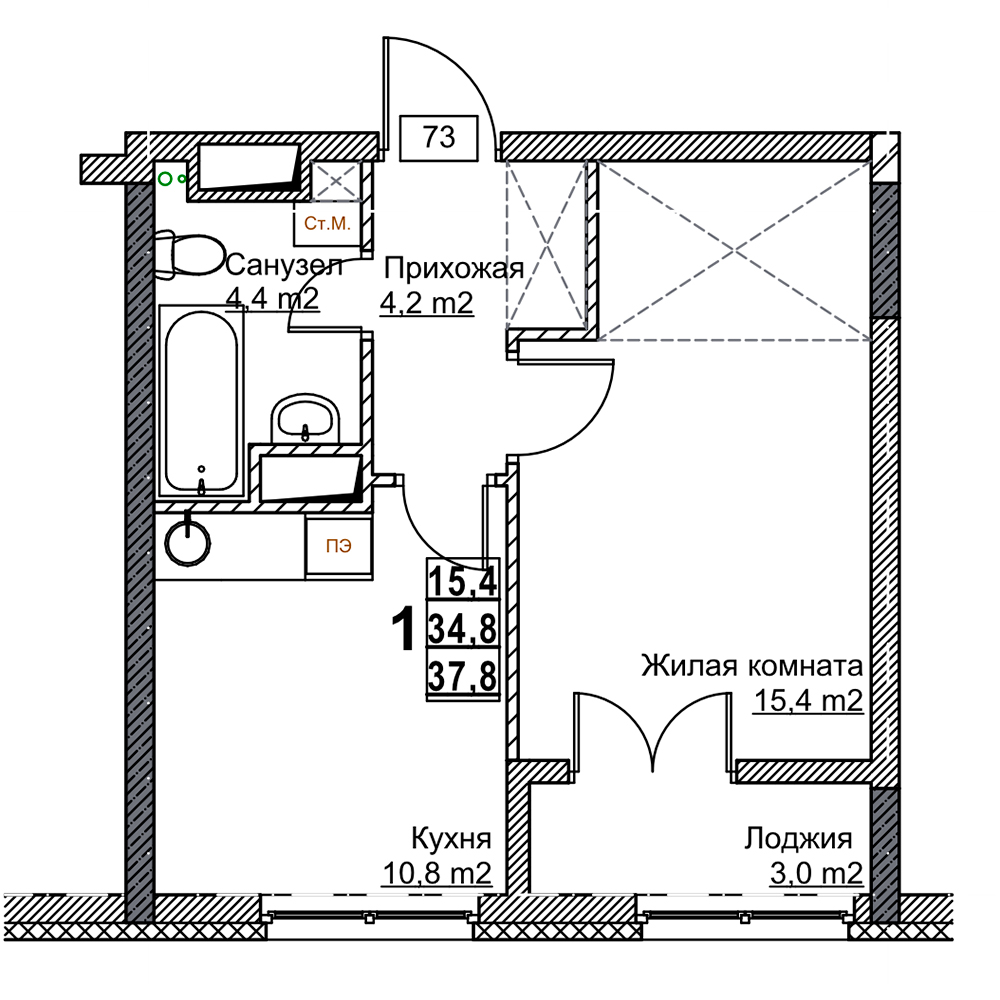 1-комнатная квартира - 37.8м2