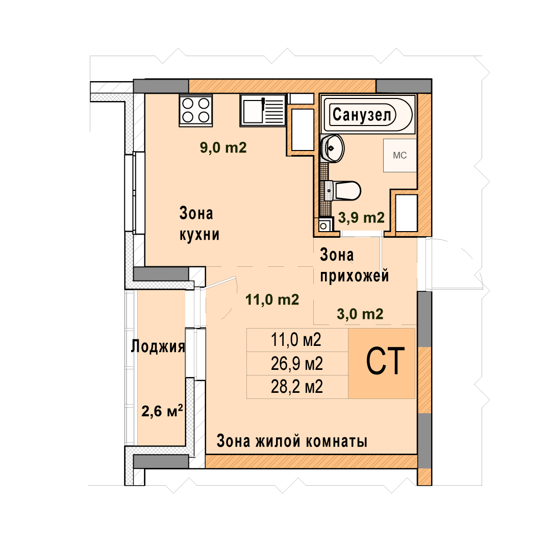 0-комнатная квартира - 28.2м2