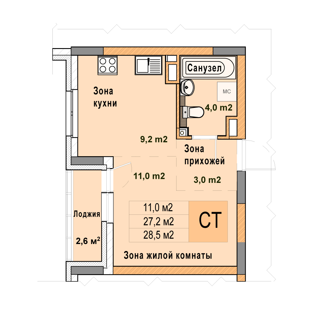 0-комнатная квартира - 28.5м2