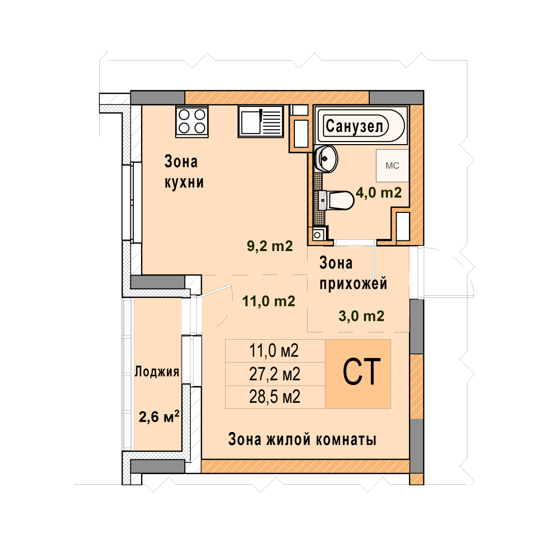 0-комнатная квартира - 28.5м2