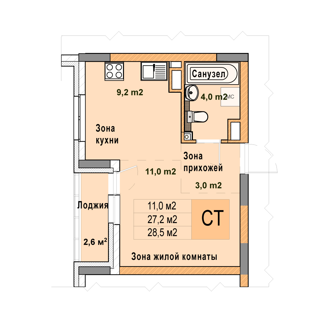 0-комнатная квартира - 28.5м2