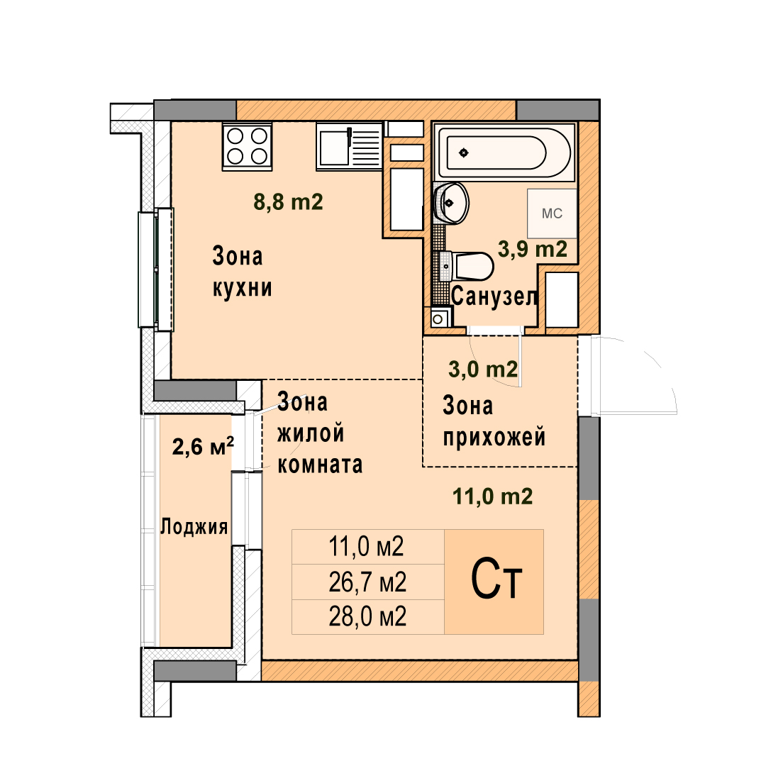 Квартира в Кузнечиха Город 28м2 на 11 этаже за 6 508 391 Р.