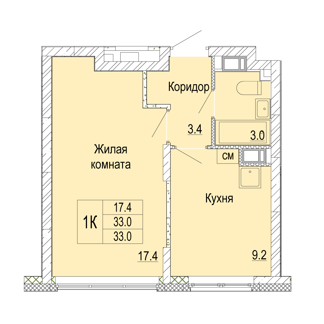 1-комнатная квартира - 33м2