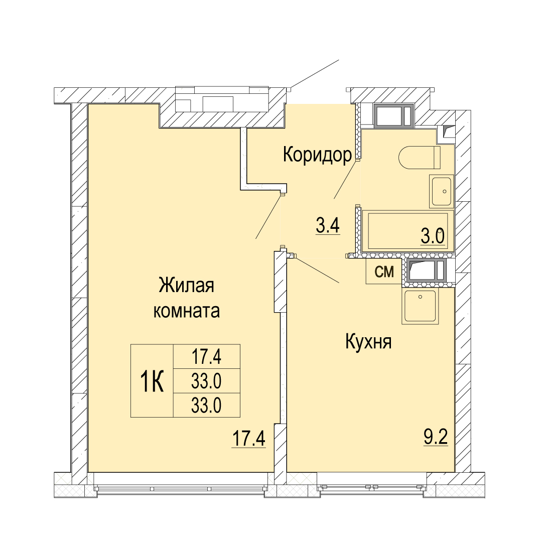 1-комнатная квартира - 33м2