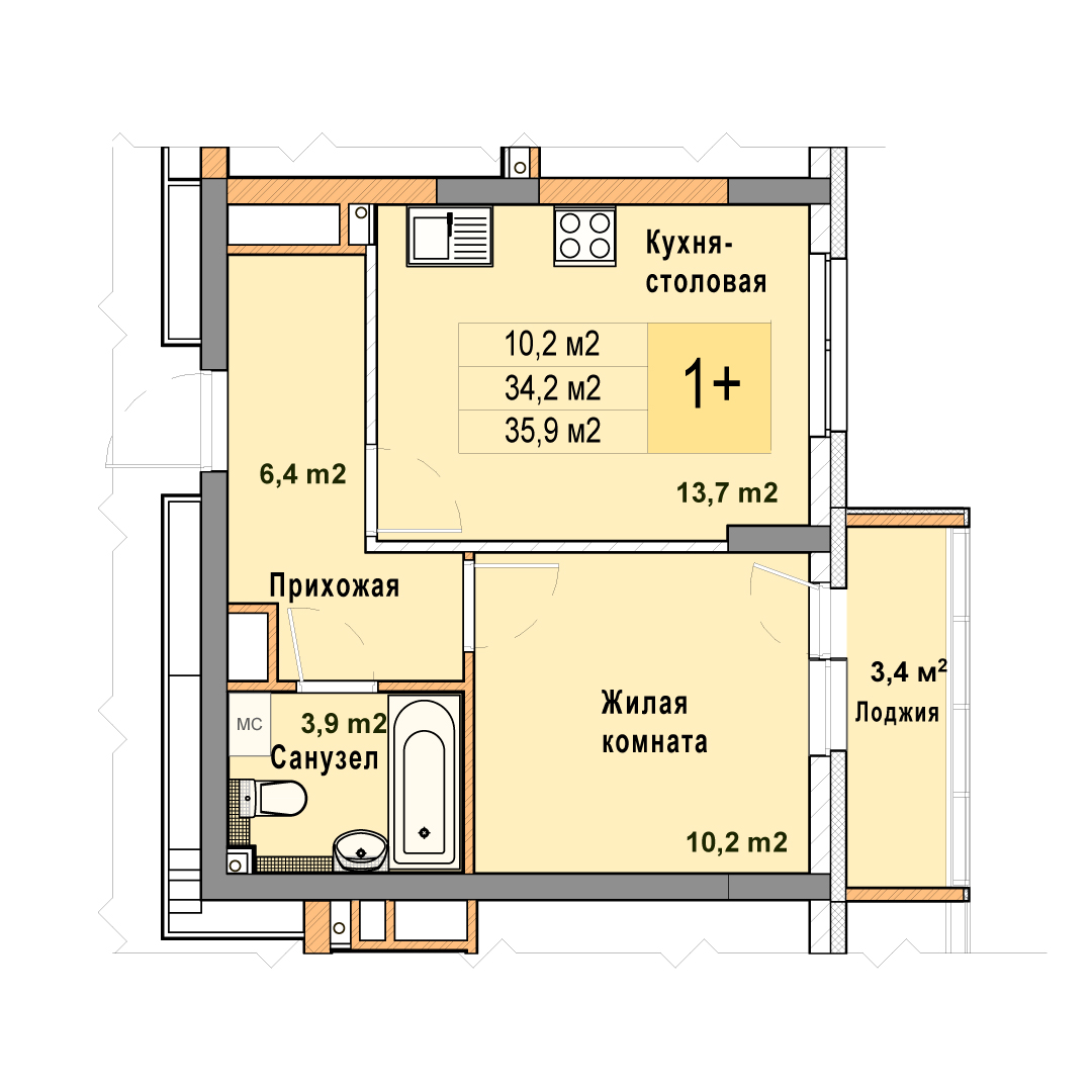 Квартира в Кузнечиха Город 35.9м2 на 13 этаже за 7 754 850 Р.