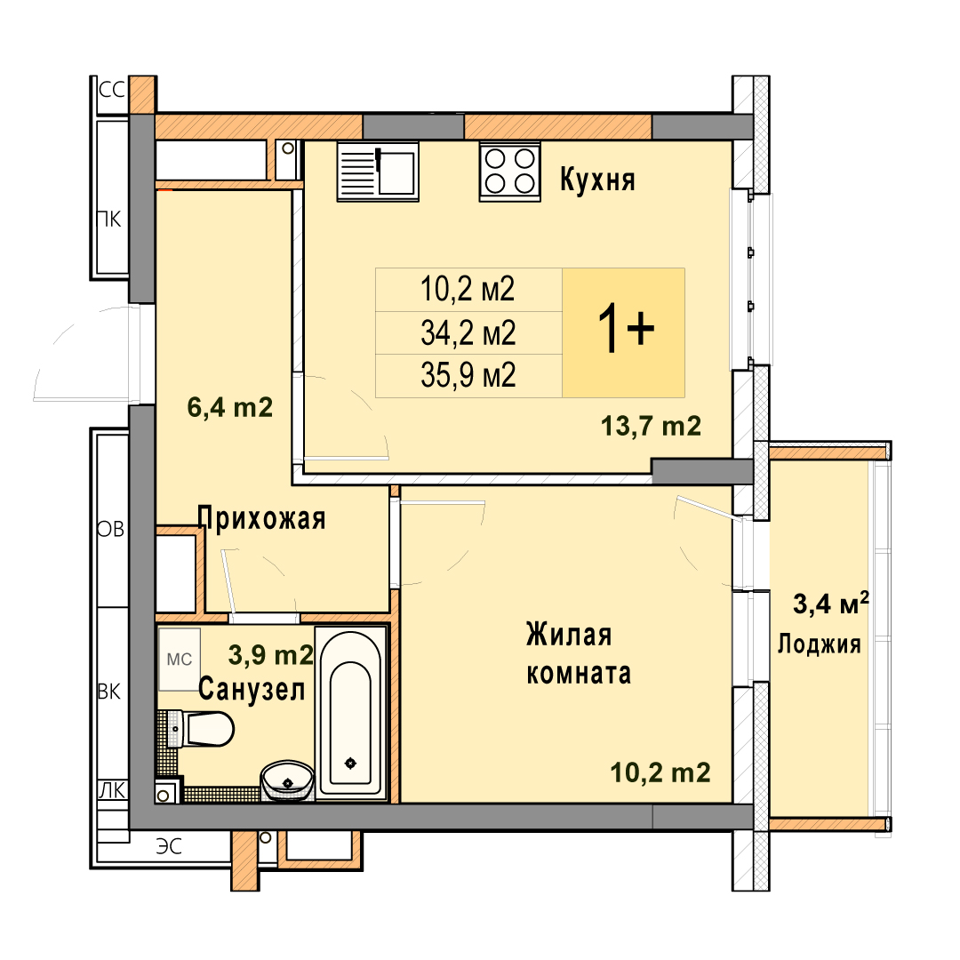 1-комнатная квартира - 35.9м2