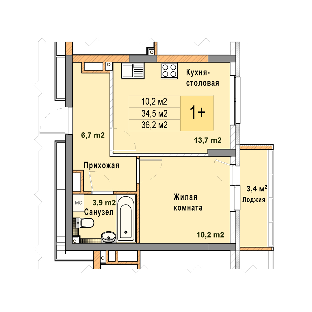 1-комнатная квартира - 36.2м2
