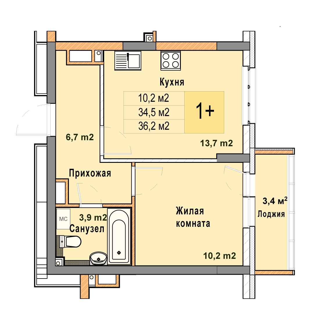 1-комнатная квартира - 36.2м2