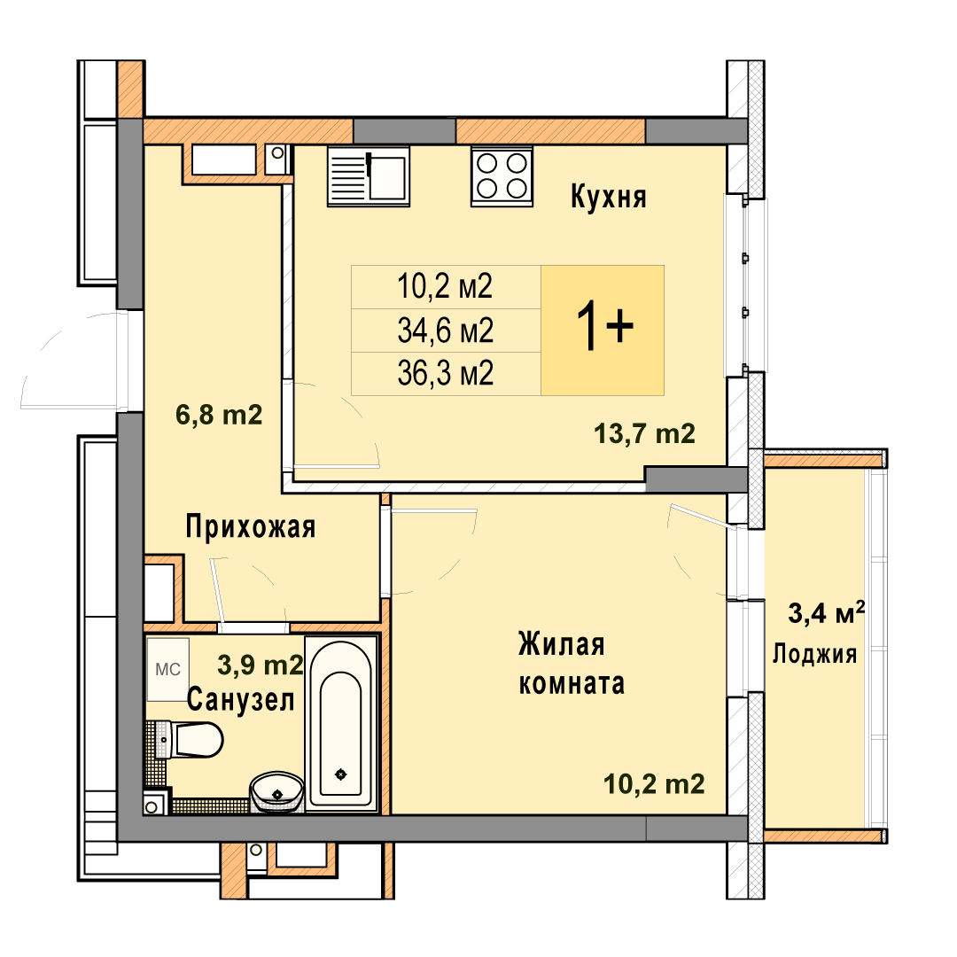 Квартира в Кузнечиха Город 36.3м2 на 6 этаже за 7 975 051 Р.