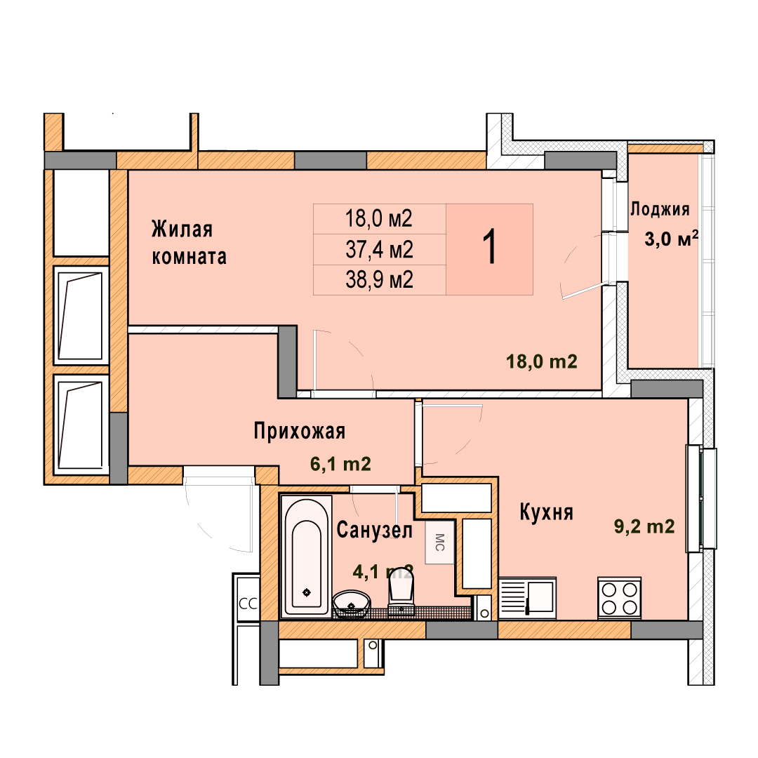 1-комнатная квартира - 38.9м2