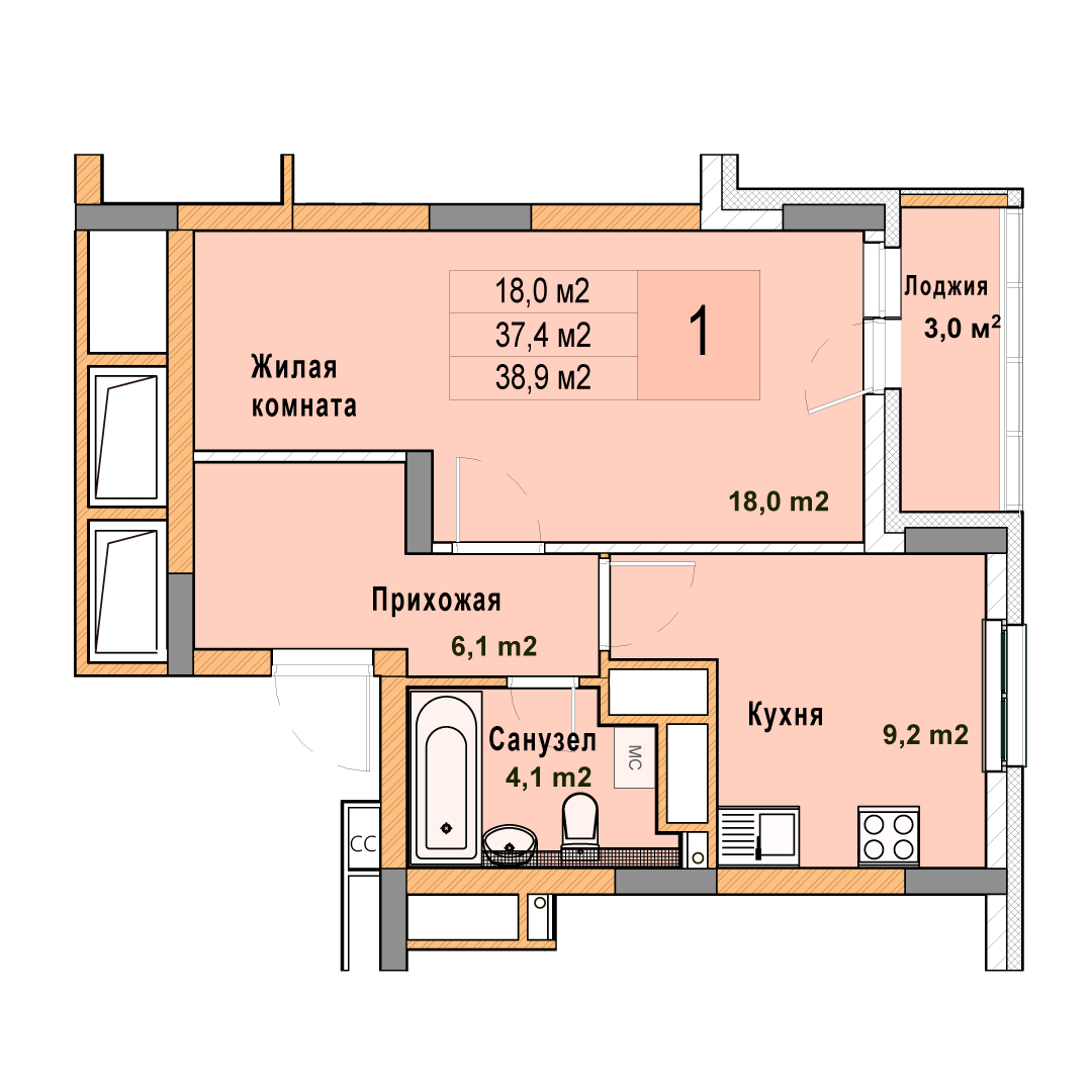 1-комнатная квартира - 38.9м2