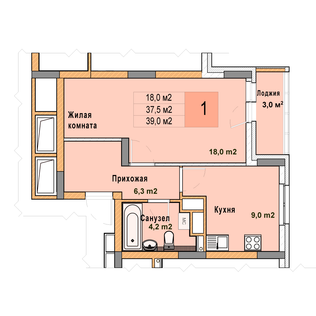 1-комнатная квартира - 39м2