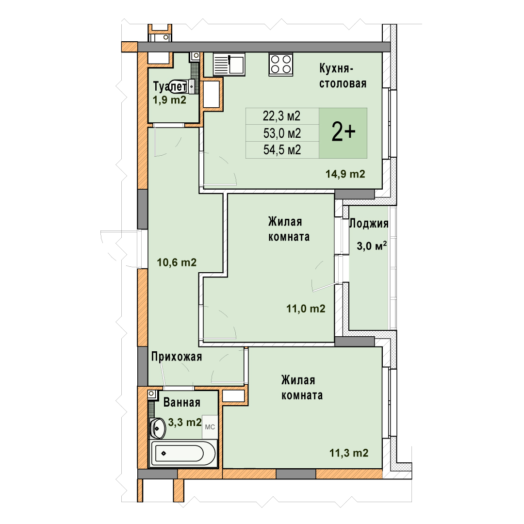 2-комнатная квартира - 54.5м2