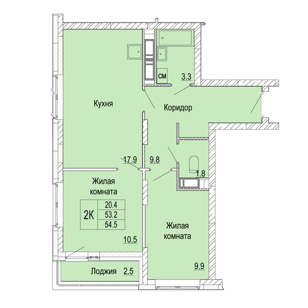 2-комнатная квартира - 54.5м2