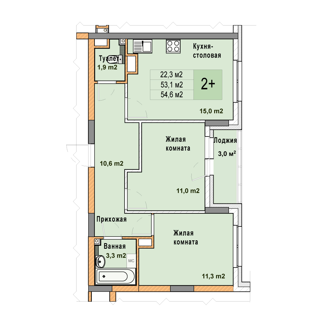 2-комнатная квартира - 54.6м2