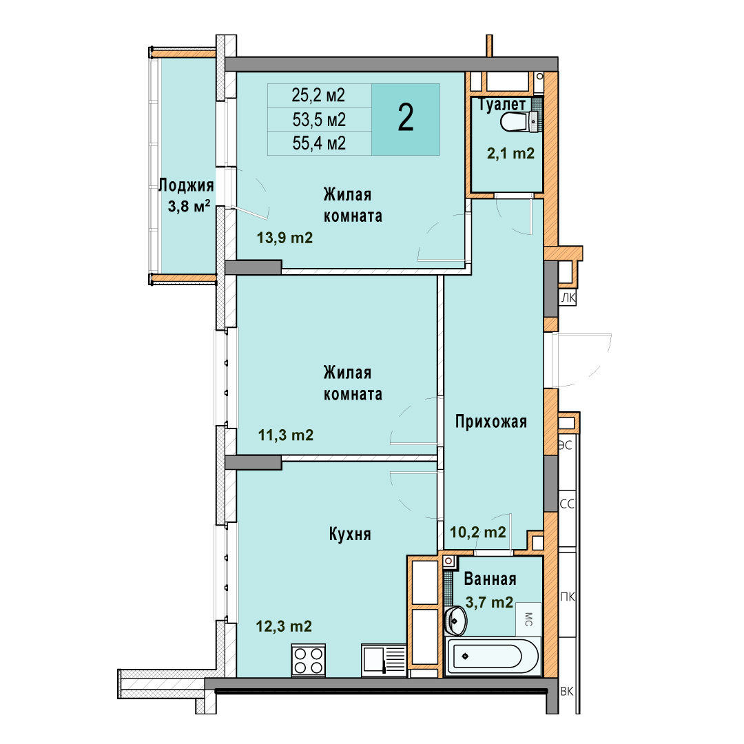 2-комнатная квартира - 55.4м2