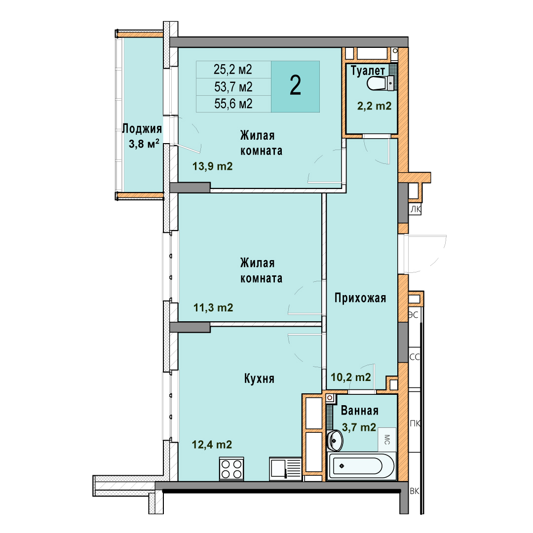 2-комнатная квартира - 55.6м2