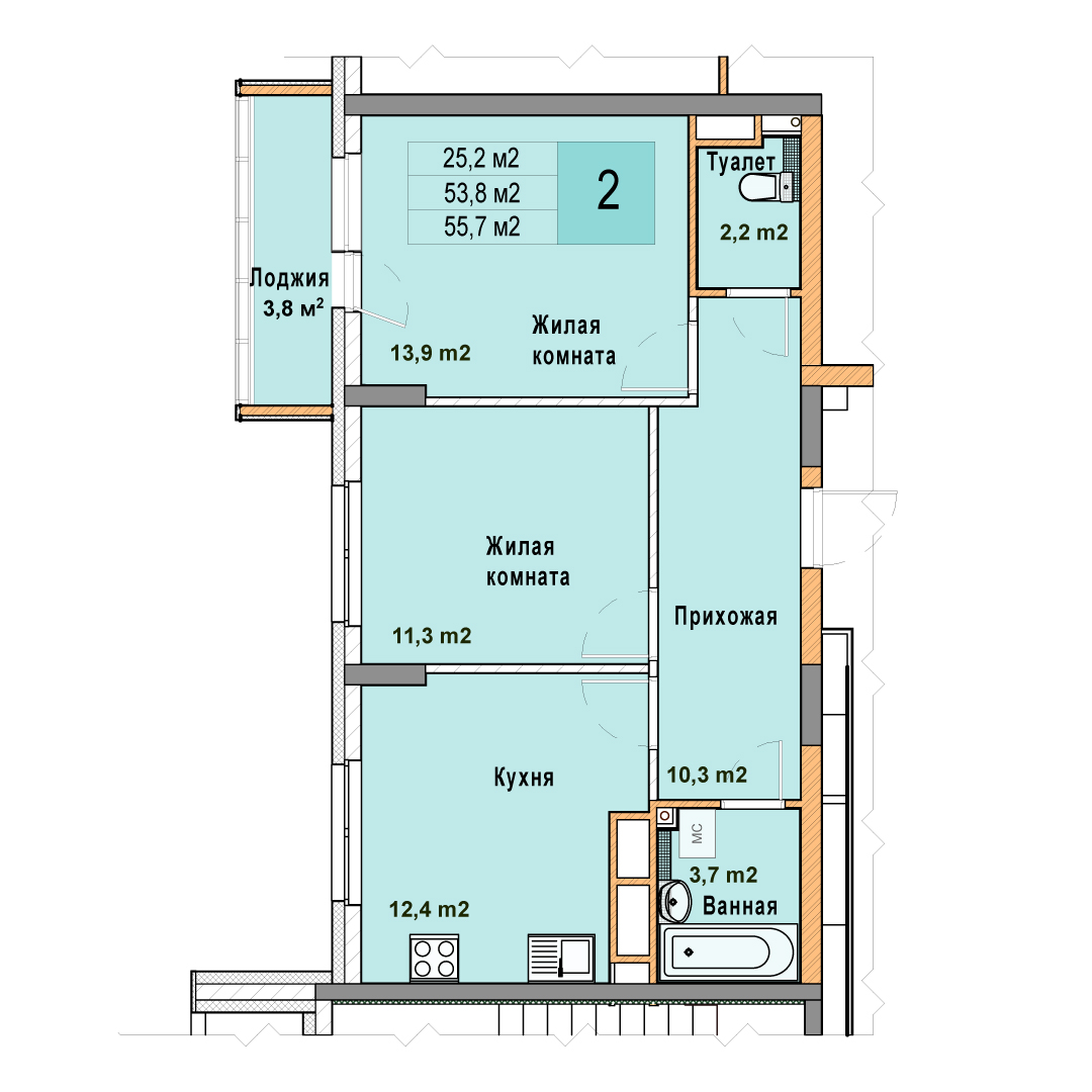 2-комнатная квартира - 55.7м2