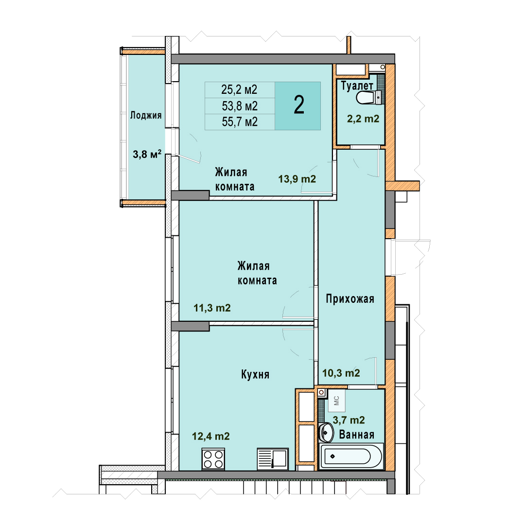2-комнатная квартира - 55.7м2