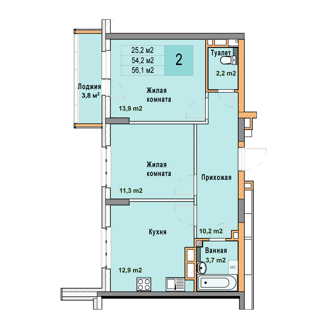 2-комнатная квартира - 56.1м2