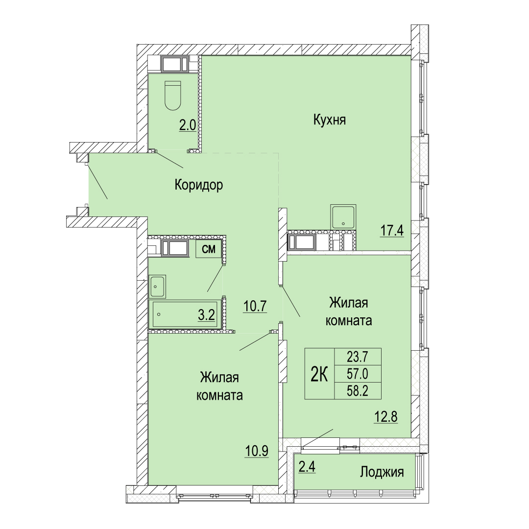2-комнатная квартира - 58.2м2