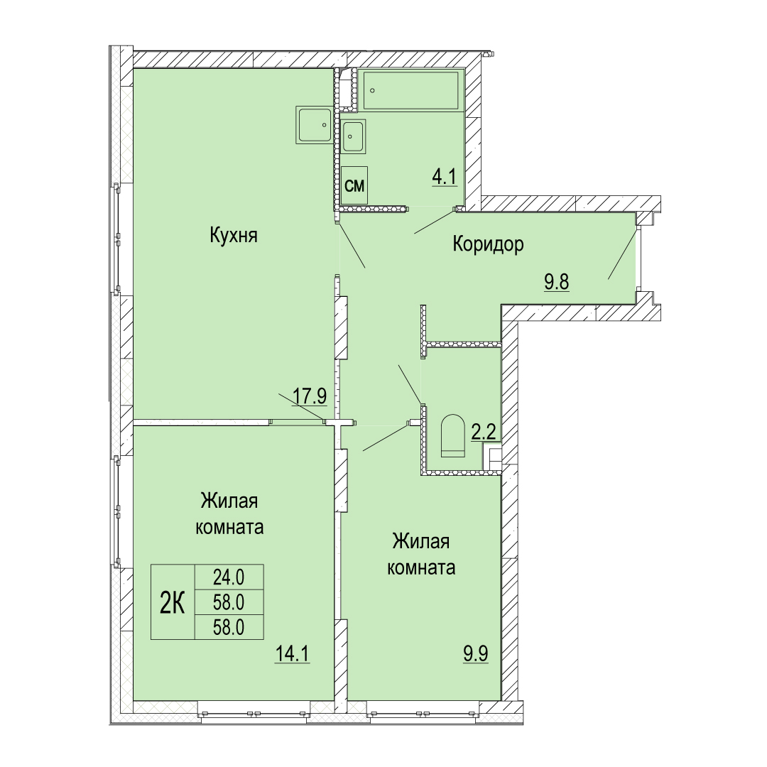 2-комнатная квартира - 58м2