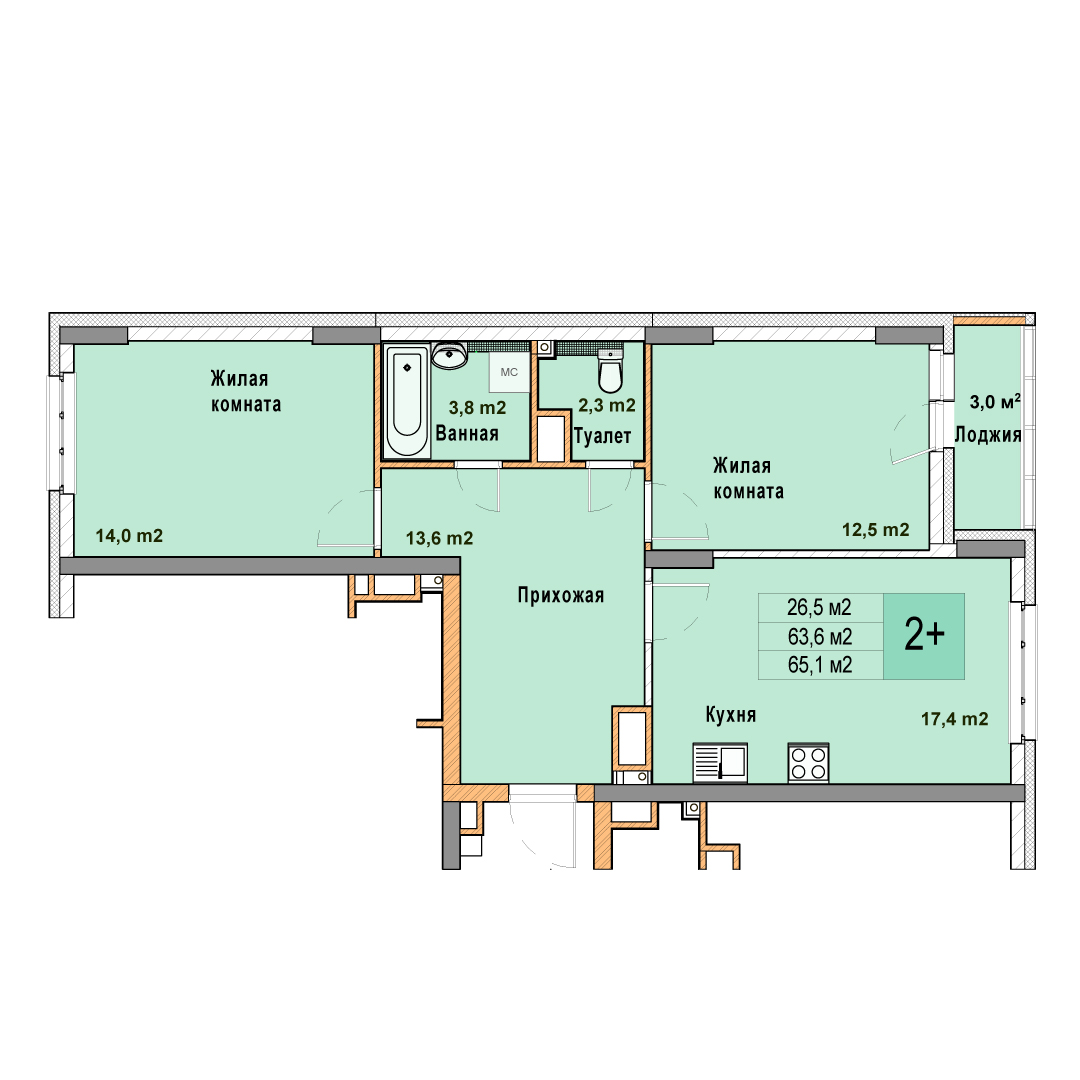2-комнатная квартира - 65.1м2
