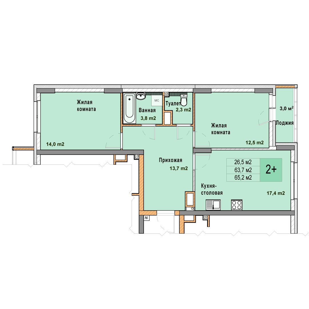 2-комнатная квартира - 65.2м2