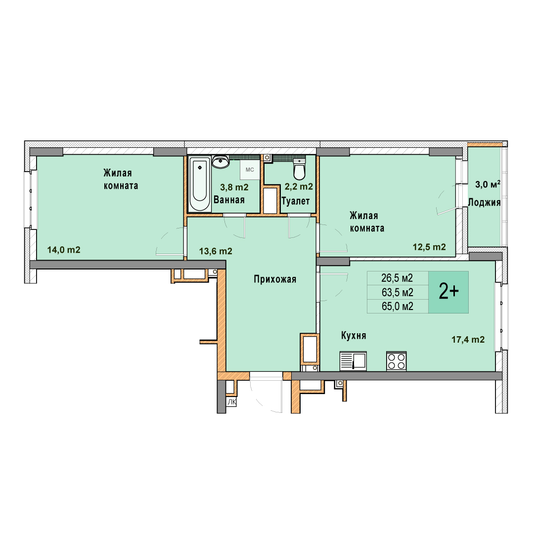 2-комнатная квартира - 65м2