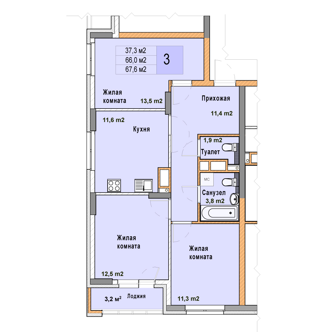 3-комнатная квартира - 67.6м2