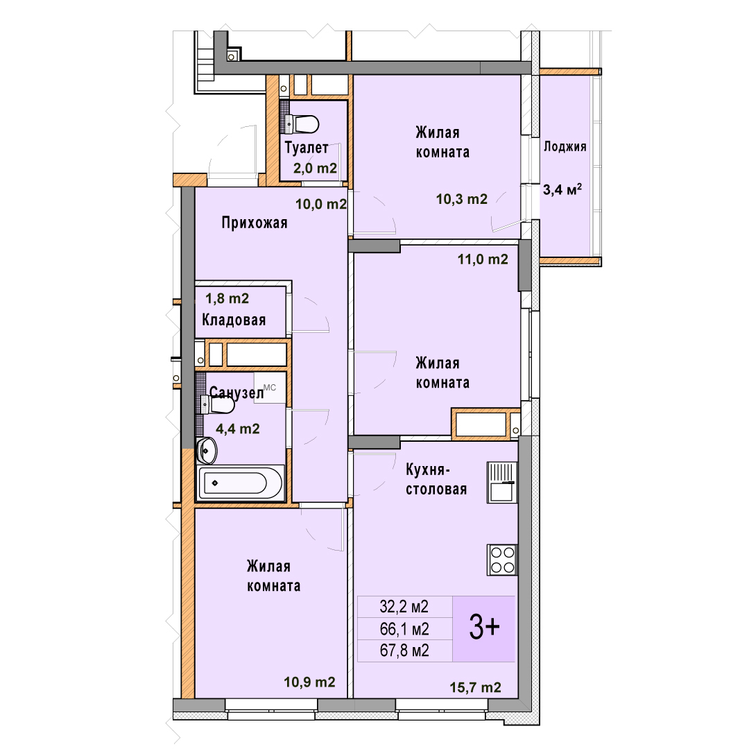 3-комнатная квартира - 67.8м2