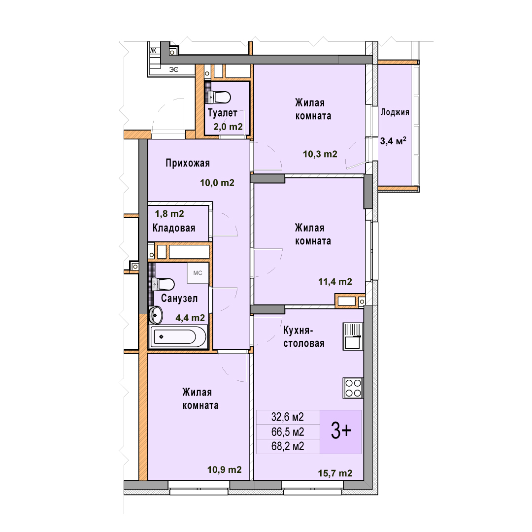 3-комнатная квартира - 68.2м2