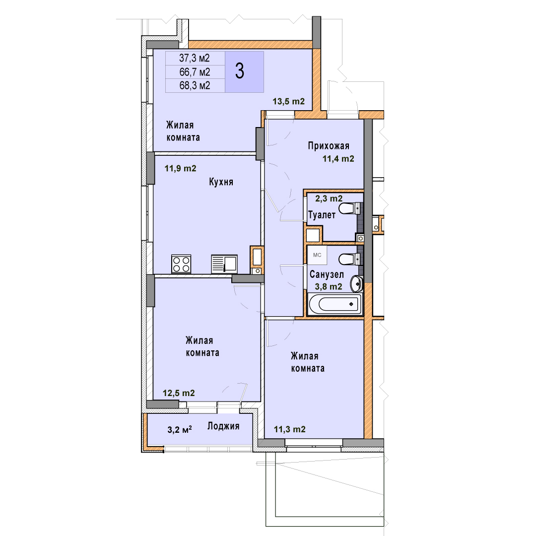 3-комнатная квартира - 68.3м2