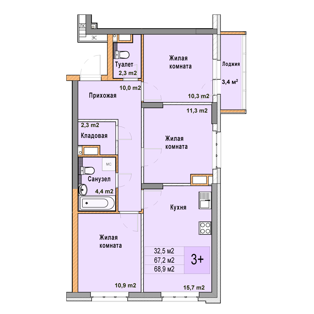 3-комнатная квартира - 68.9м2