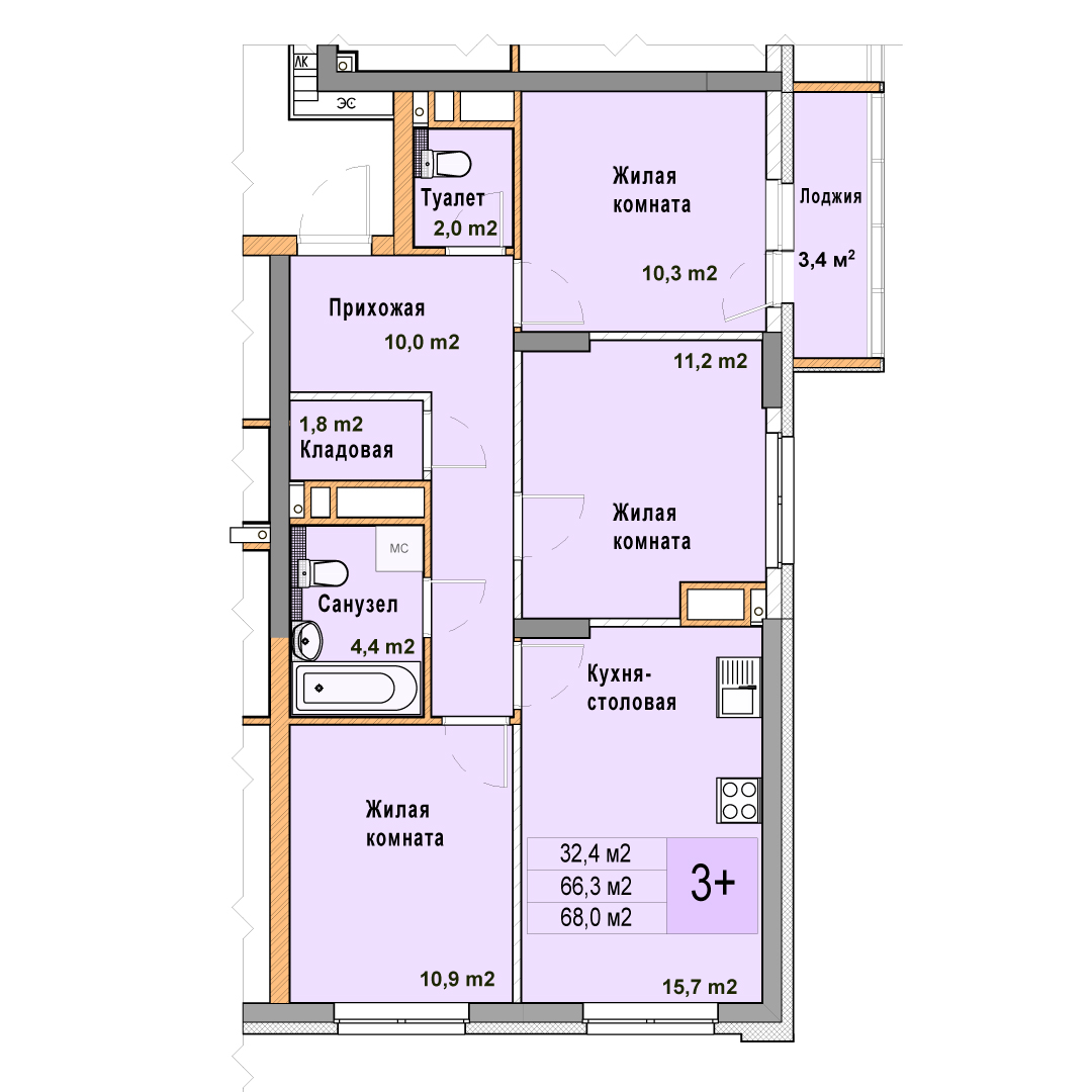 3-комнатная квартира - 68м2
