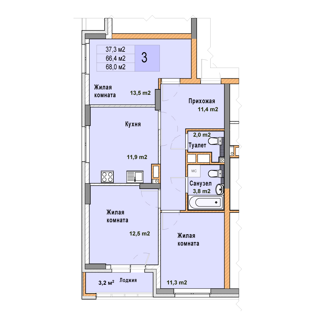 3-комнатная квартира - 68м2