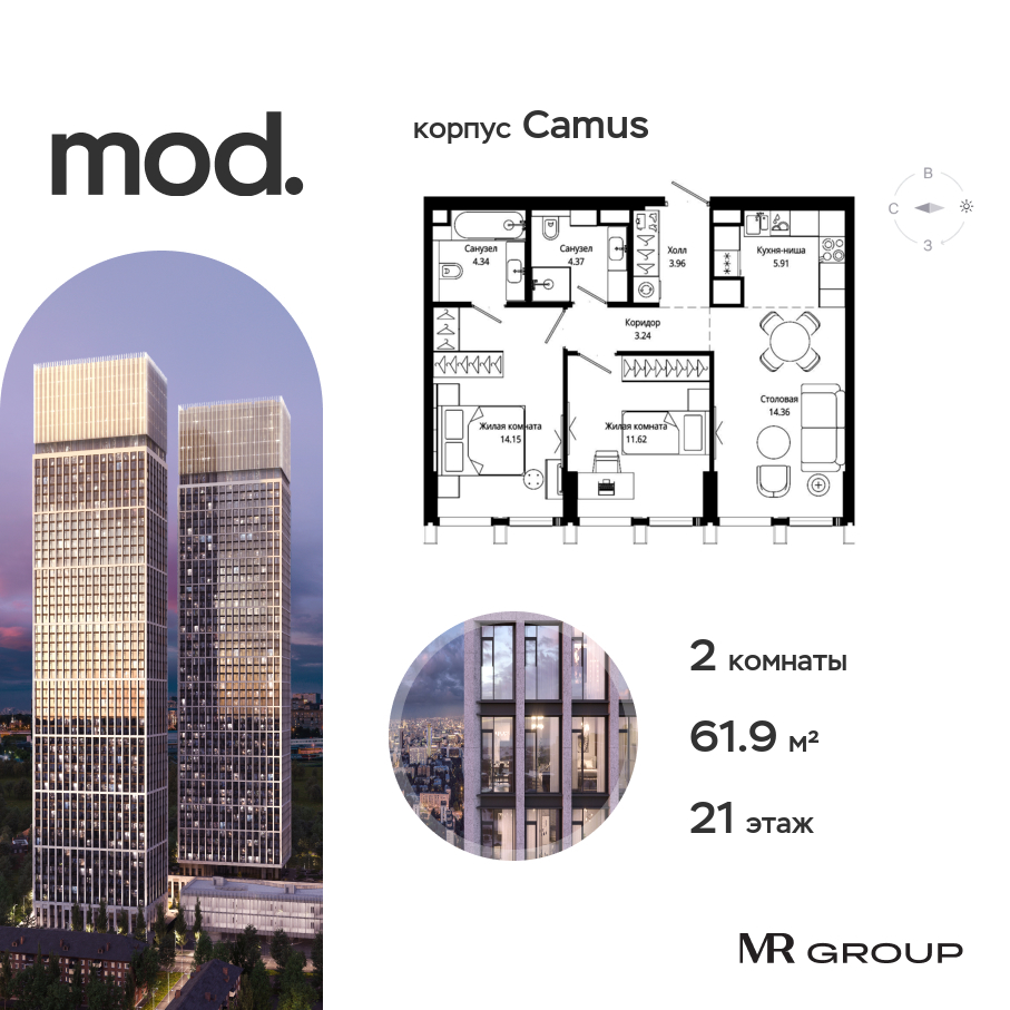 Квартира в Mod 61.95м2 на 21 этаже за 36 166 410 Р.