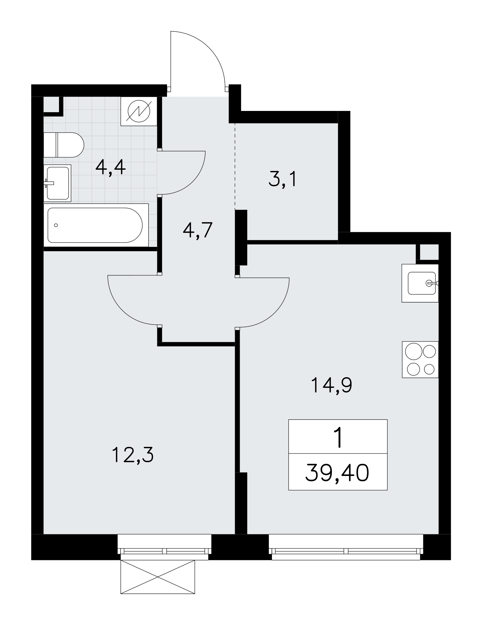 1-комнатная квартира - 39.4м2