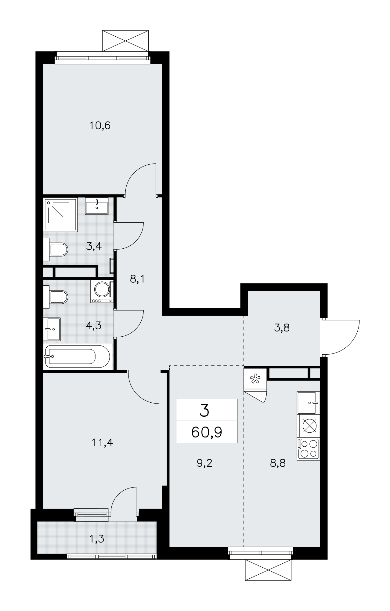 3-комнатная квартира - 60.9м2