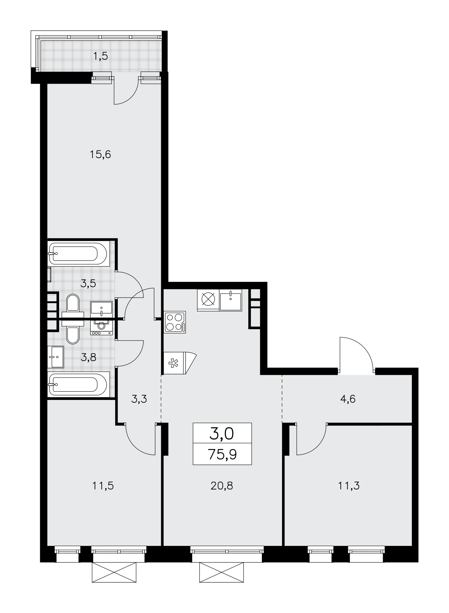 3-комнатная квартира - 75.9м2