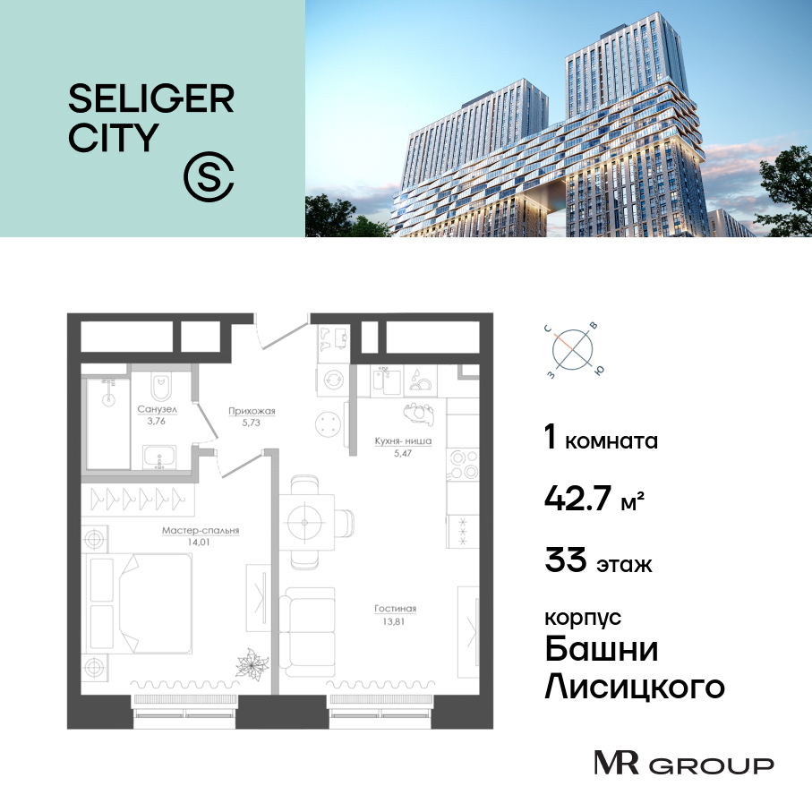 Квартира в Селигер Сити 43.07м2 на 33 этаже за 28 968 882 Р.