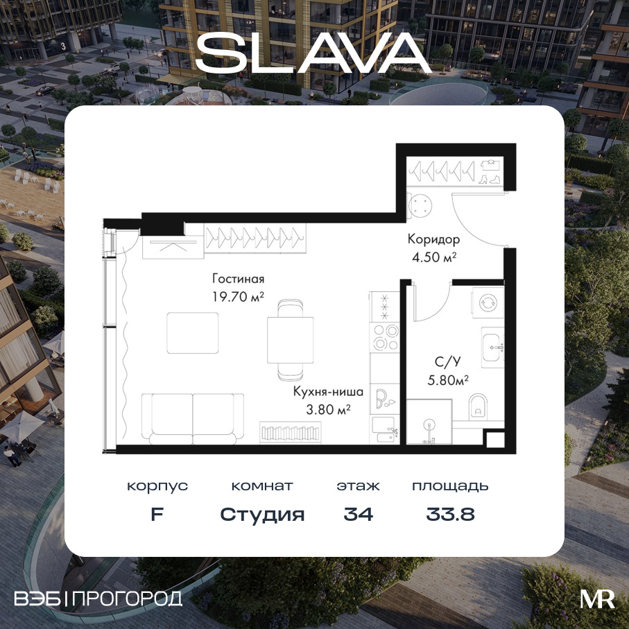 Квартира в SLAVA 33.80м2 на 34 этаже за 36 906 220 Р.