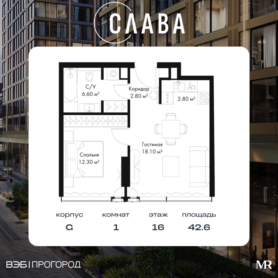 Квартира в SLAVA 42.60м2 на 16 этаже за 48 393 600 Р.