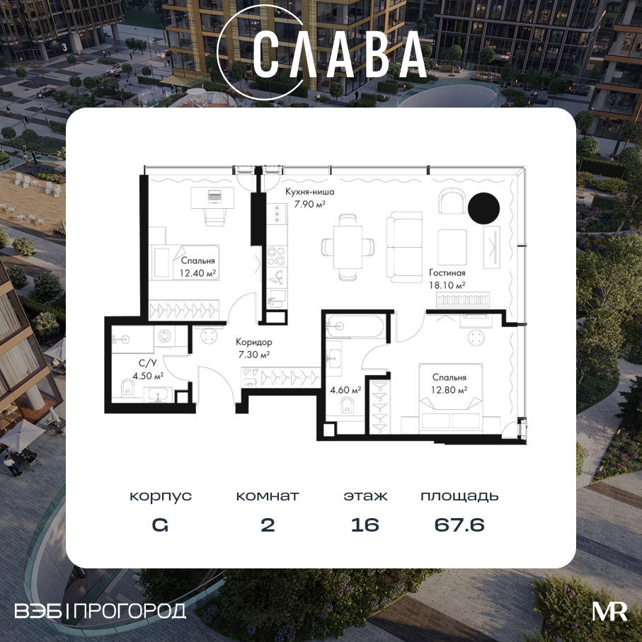 Квартира в SLAVA 67.60м2 на 16 этаже за 69 472 520 Р.