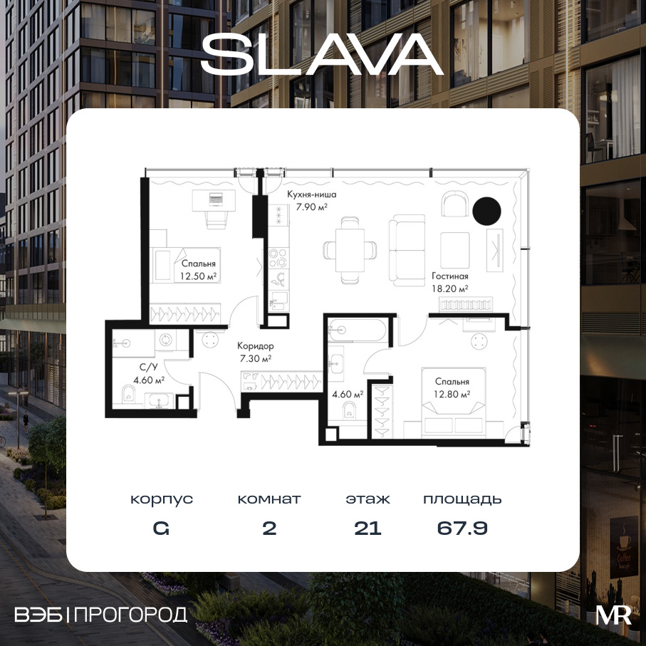 Квартира в SLAVA 67.90м2 на 21 этаже за 68 470 360 Р.