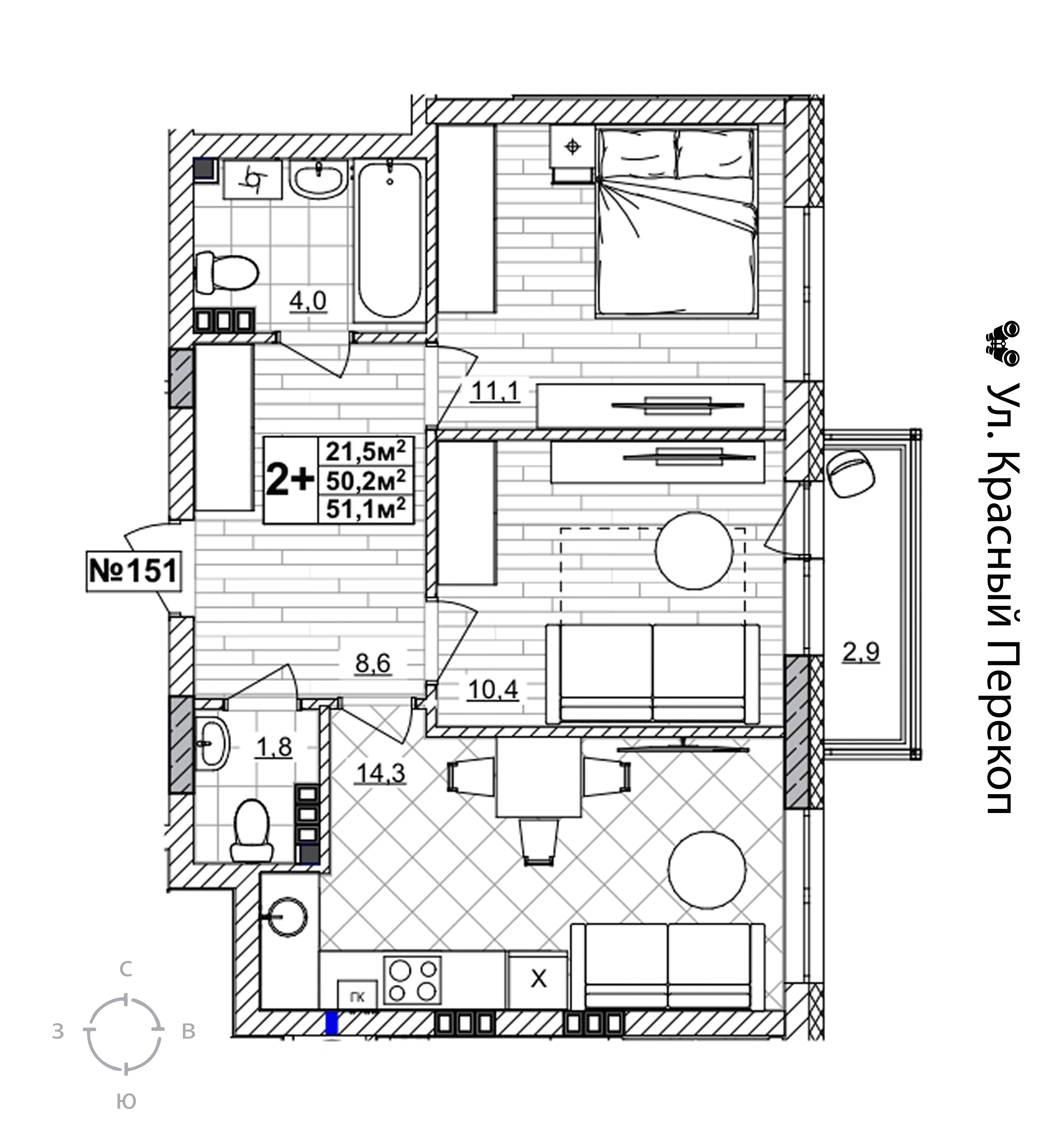 2-комнатная квартира - 51.1м2