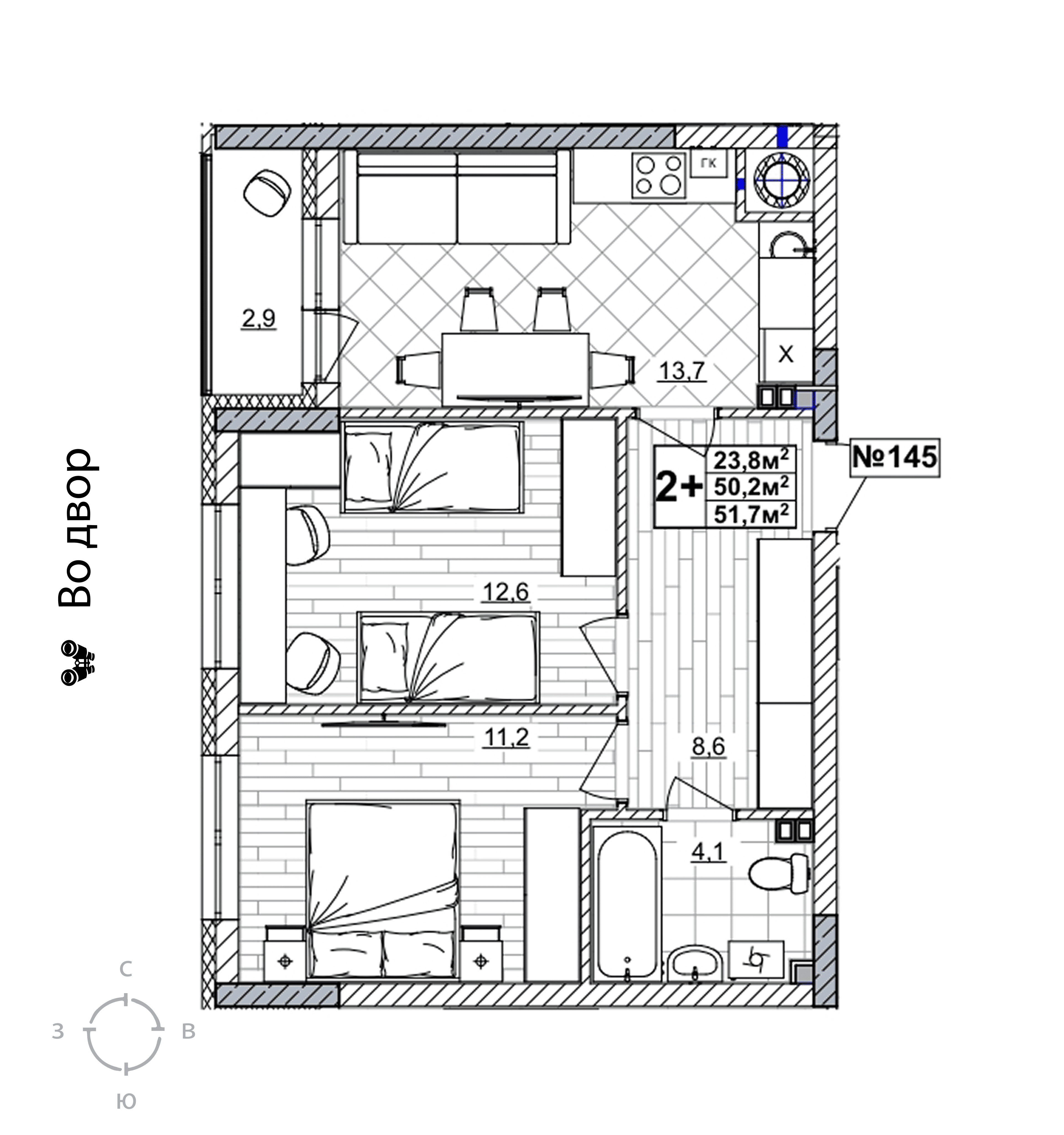 2-комнатная квартира - 51.7м2
