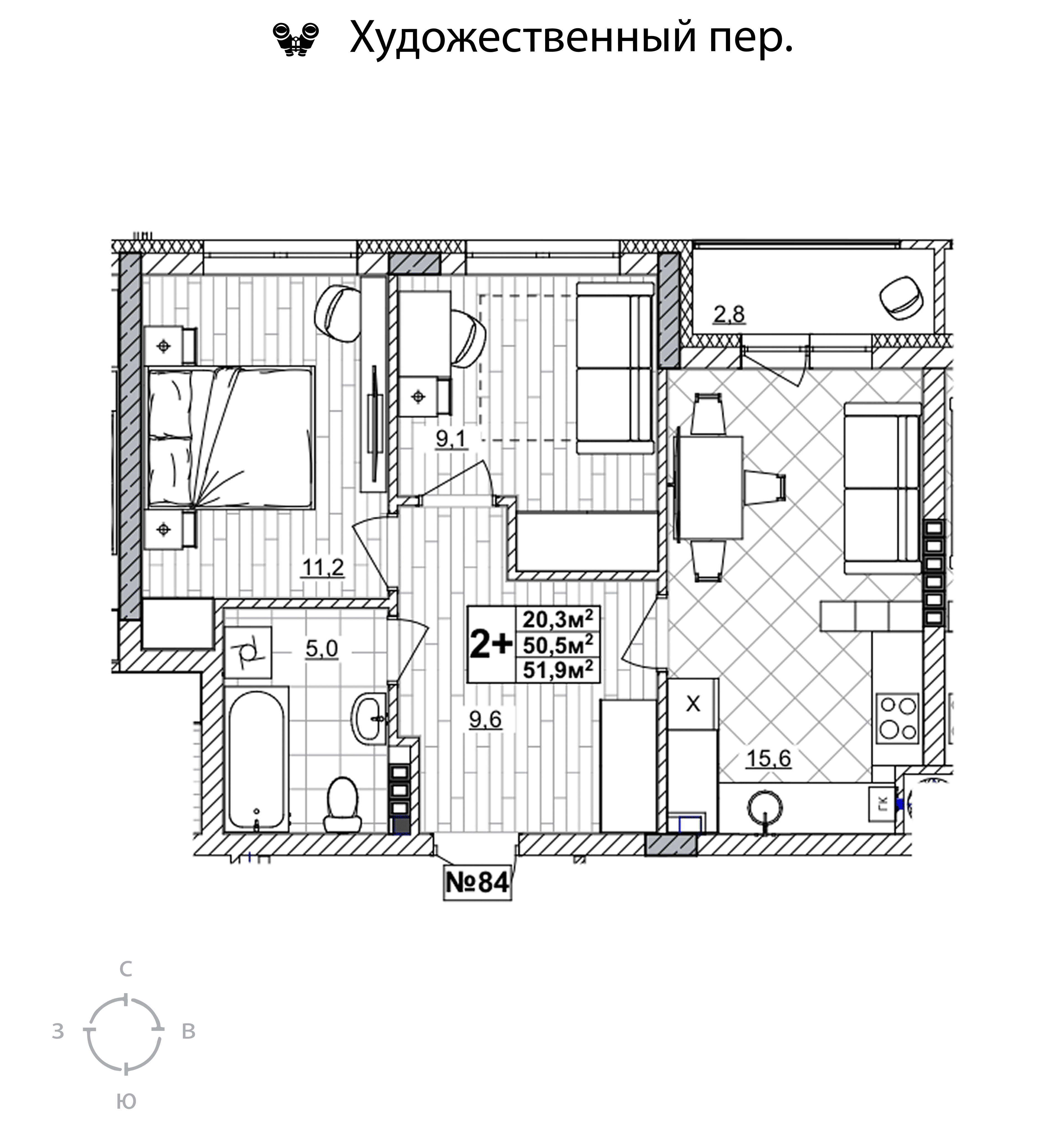 2-комнатная квартира - 51.9м2