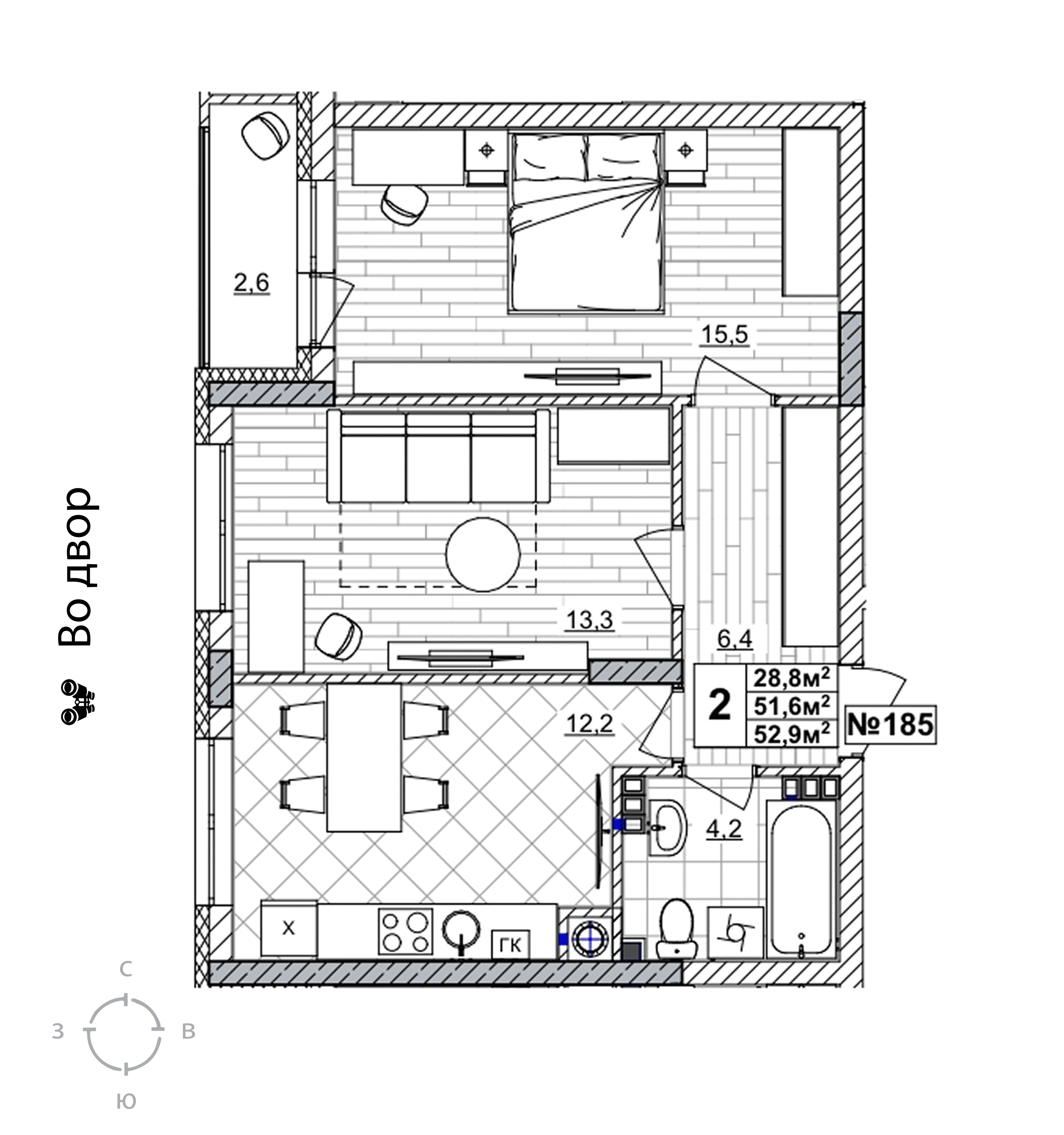 2-комнатная квартира - 52.9м2