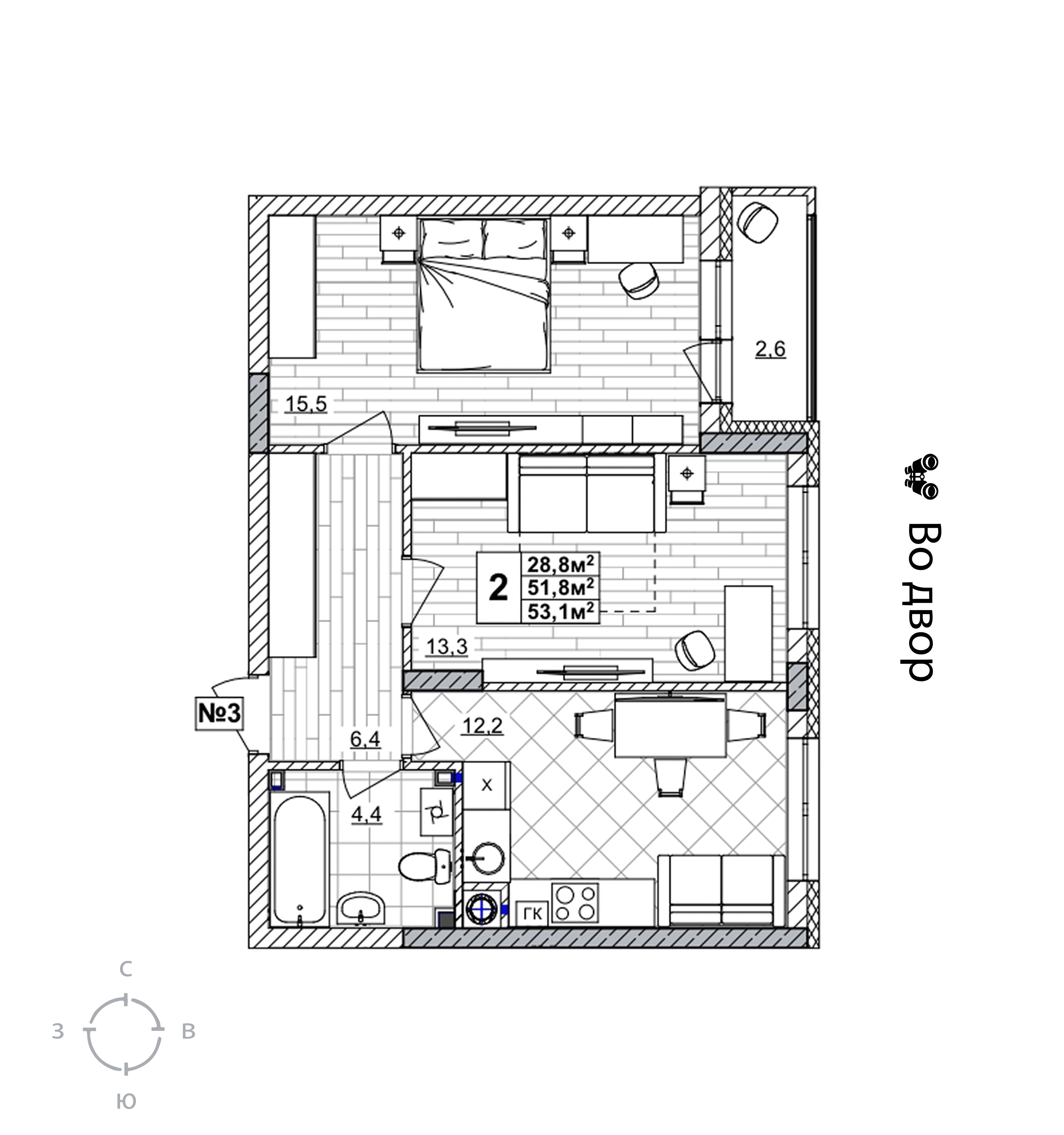 Квартира в Смородина 53.1м2 на 1 этаже за 7 890 000 Р.